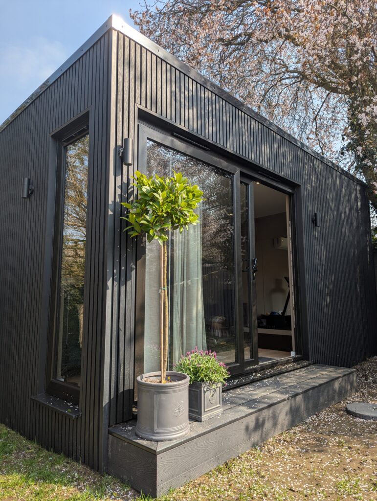 Built with planning approval to allow a 2.5m internal ceiling height, this 5m x 3m garden gym delivers a professional training environment right at home. Clad in contemporary black slatted style composite boards for a bold architectural finish, it combines form and function beautifully — a purpose-built space for strength, movement, and wellbeing, crafted to the highest standards.