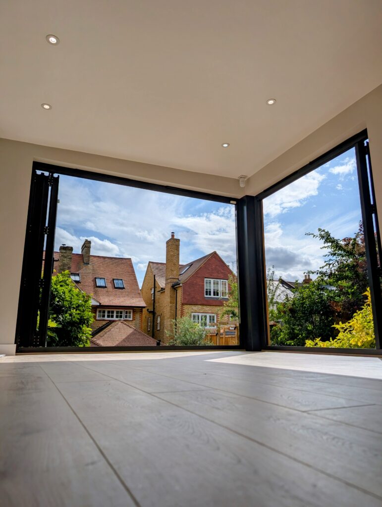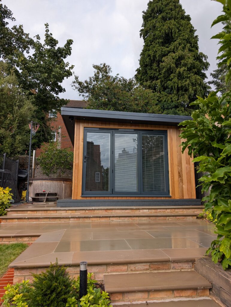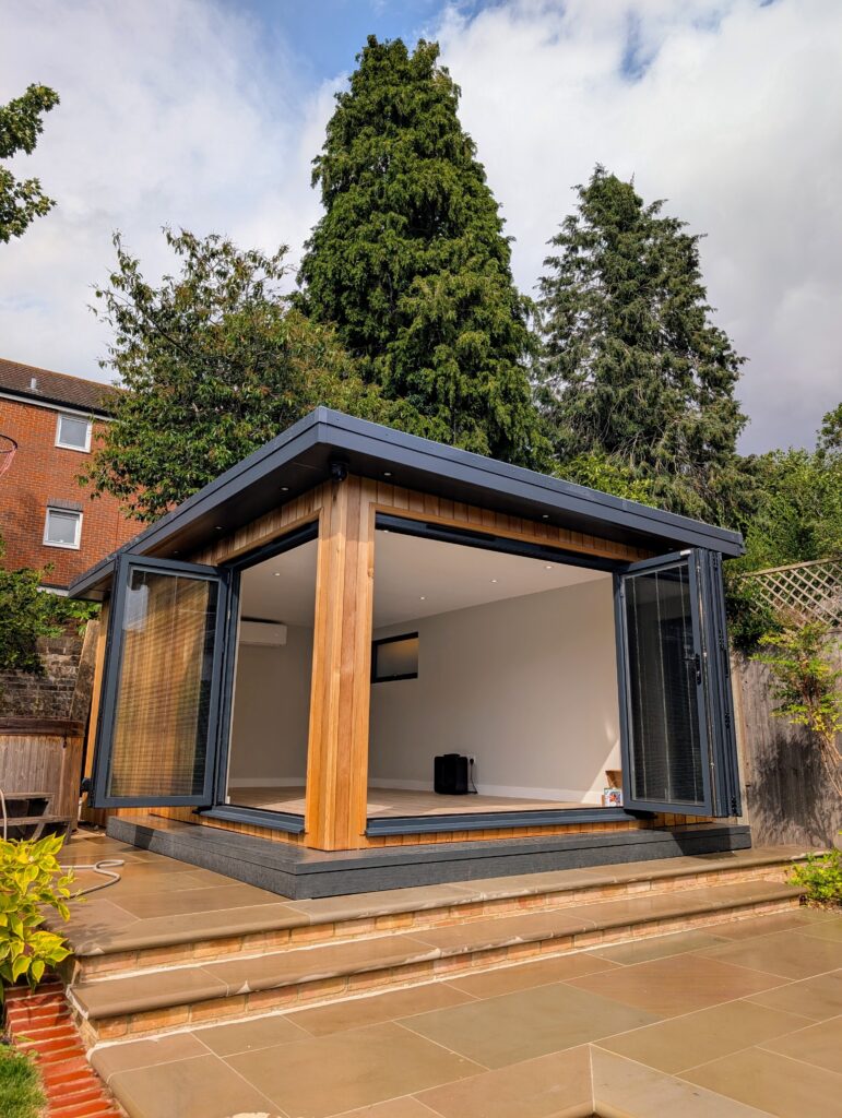 This 6m x 3.5m garden room in central St Albans is clad in timeless Western Red Cedar, making it a stunning focal point within a newly landscaped garden. Designed as a multi-purpose space, it serves as a TV lounge and chill-out zone while also housing a Wattbike and weights for fitness. Two sets of bi-fold doors flood the room with natural light and open seamlessly onto the garden, creating a bright, flexible space perfect for both relaxation and exercise.